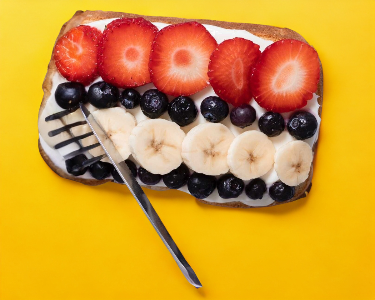 Pan tostado montado con queso crema, plátano, blueberry y fresas.