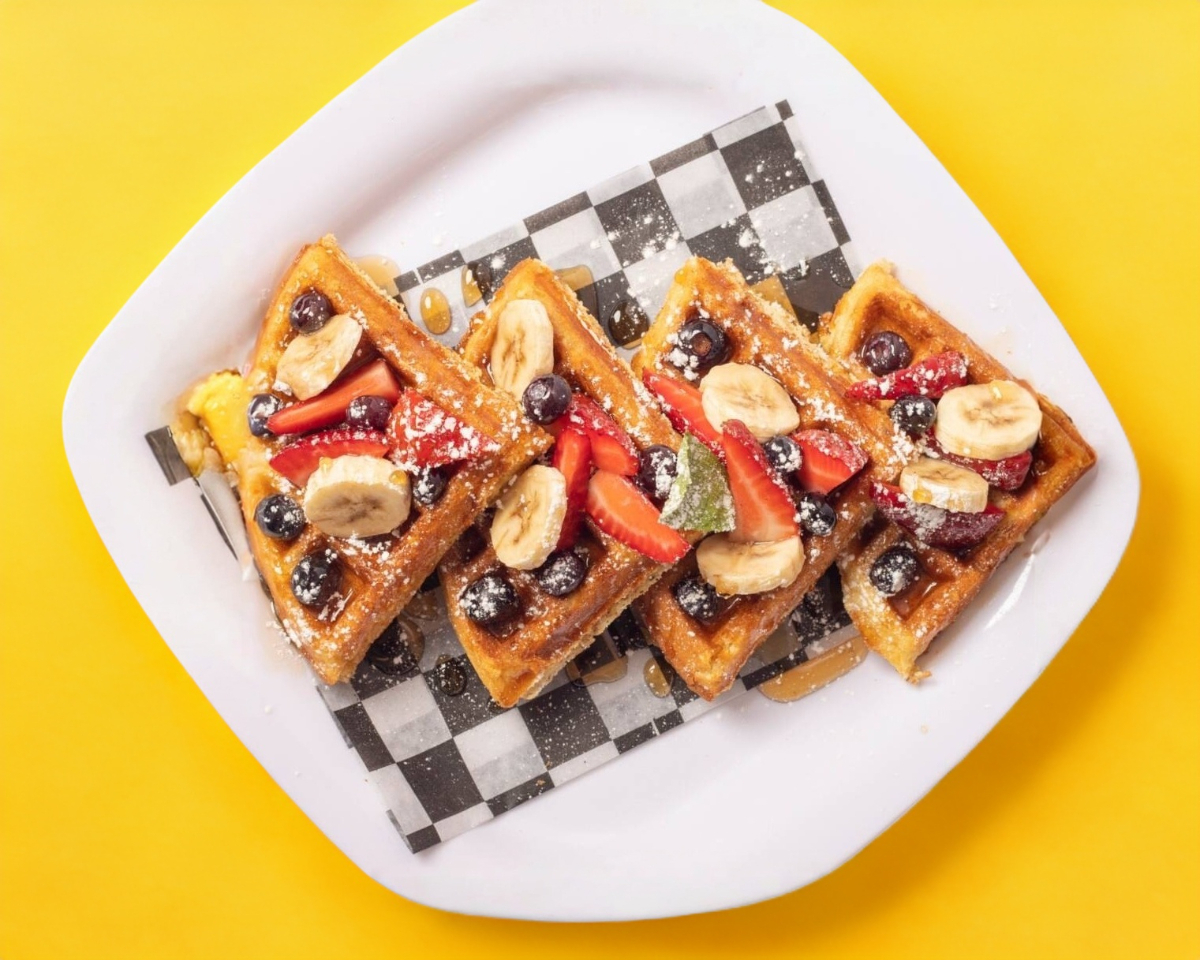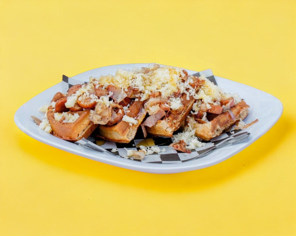Waffle con tocino, salchicha polaca, queso asadero y miel de maple.