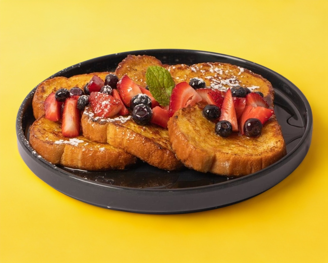 Tres rebanadas de pan francés, acompañado de fresas y moras azules.
