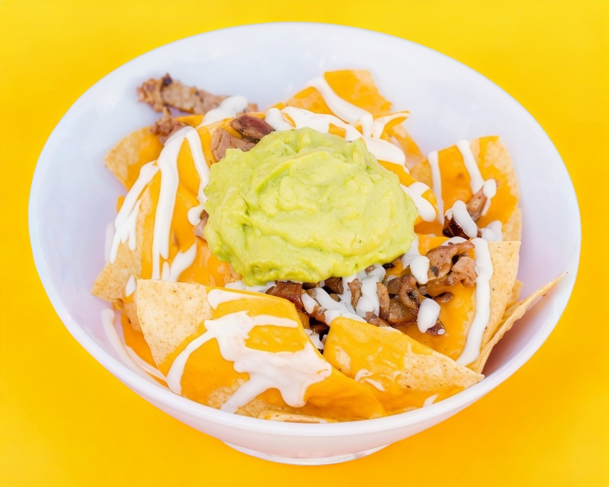 Orden de nachos, servidos con guacamole, crema y bistec a la plancha.