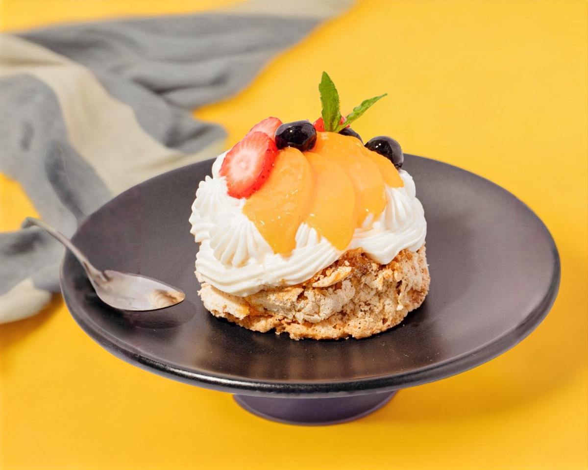 Merengue con una mezcla entre crujiente y suave, con el contraste de fresa y durazno.