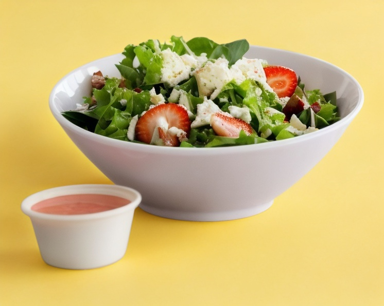 Mezcla de verdes, nueces garapiñadas, manzana verde, fresas, queso panela y aderezo dulce de la casa.
