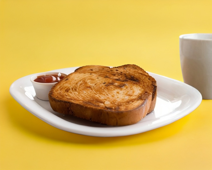 Tres rebanadas de pan tostado, con mantequilla y mermelada de fresa.