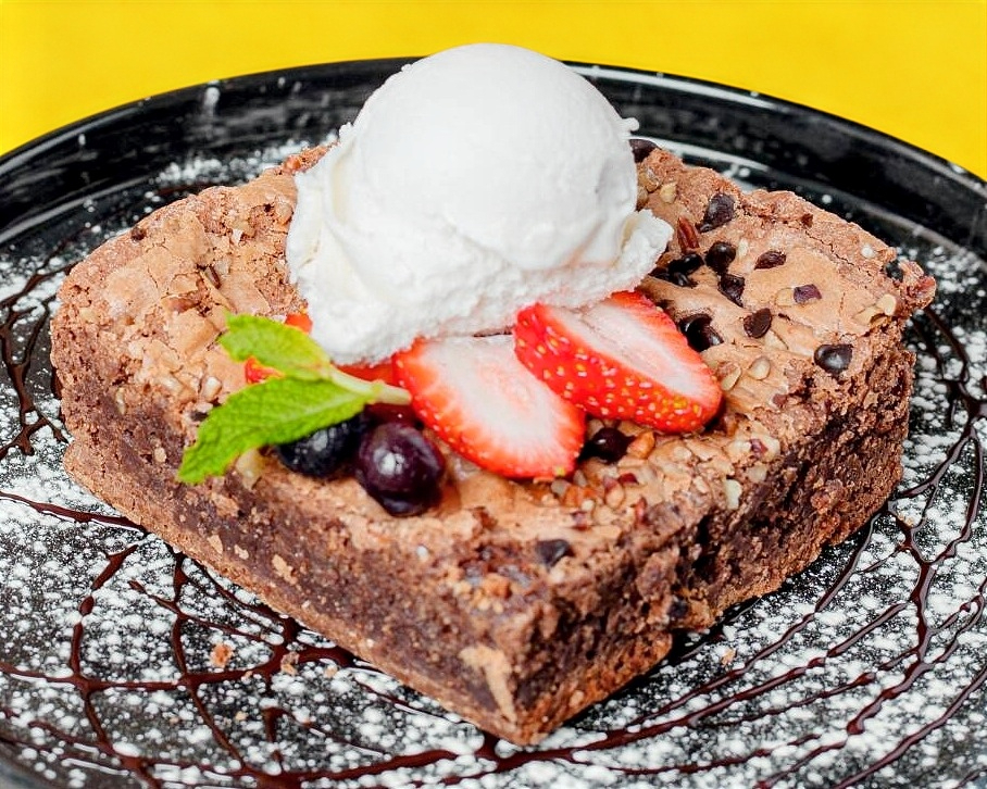 Brownie de chocolate caliente, servido con nieve de vainilla.