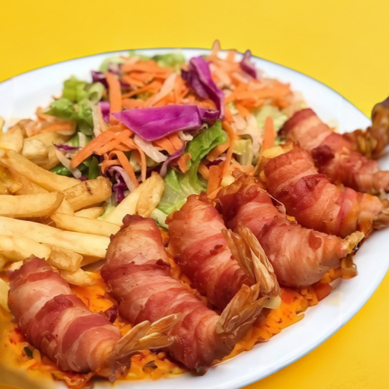 Camarones con queso envueltos en tocino, con arroz y ensalada.