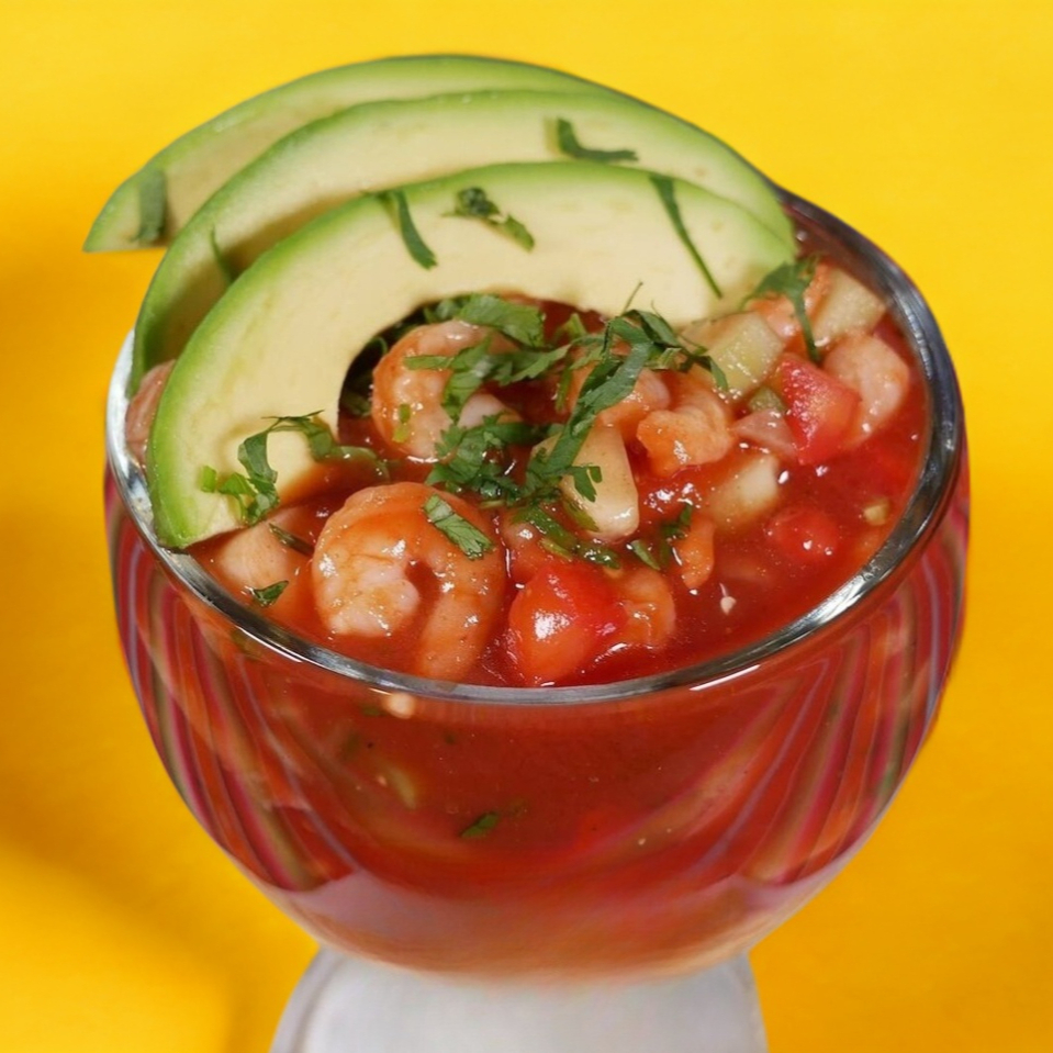 Camarón cocido, pepino, cebolla, cilantro, tomate, jugo, aguacate.