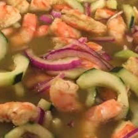 Camarón, pepino, tomate, cebolla, cilantro, condimentos.