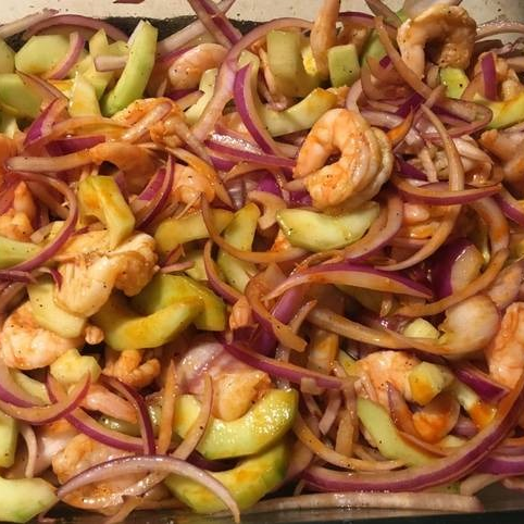 Camarones, cebolla, chile del árbol, salsa valentina, arroz y ensalada.