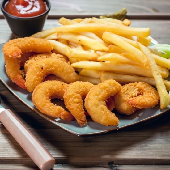 Camarones empanizados con arroz y ensalda.