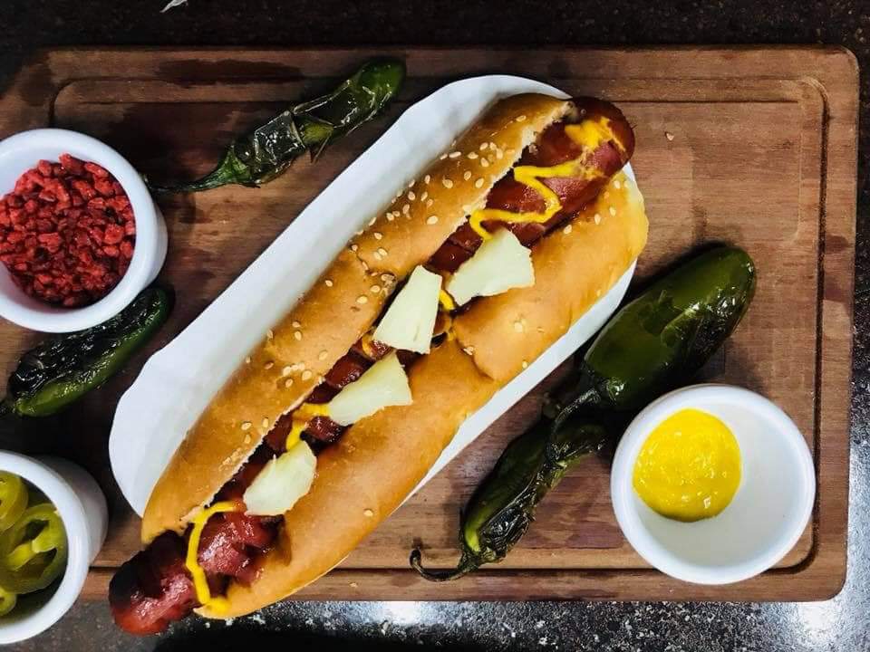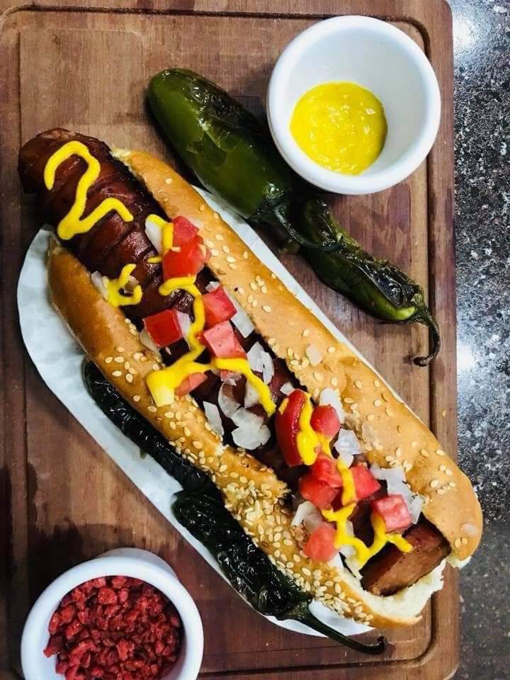 Polaco Mexicano porcion personal contiene Salchicha rellena de Philadelphia y chilaca, envuelta en tocino, frijoles, salsa verde , cebolla, tomate, mayonesa, catsup, mostaza, crema y queso amarillo, aderezos