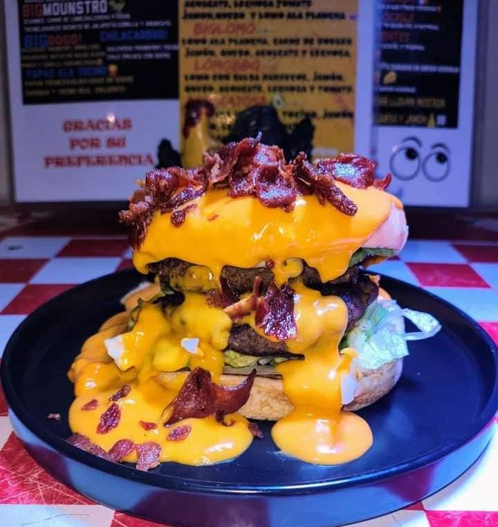 BURGER DOBLE BAÑADA EN QUESO CHEDDAR Y TOCINO