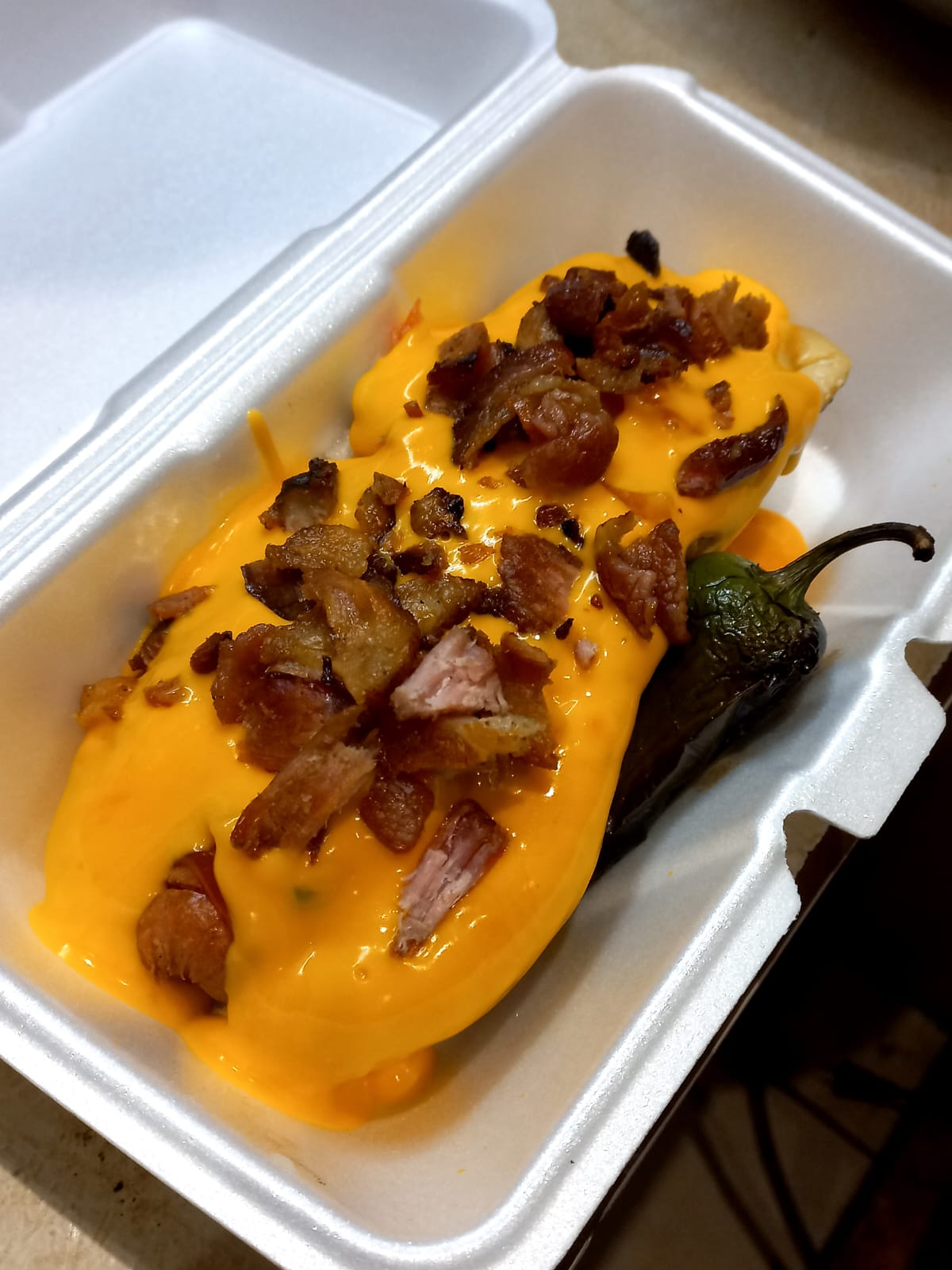 SALCHICHA DE PAVO, PICO DE GALLO, ADEREZOS BAÑADO EN QUESO CHEDDAR TOCINO.