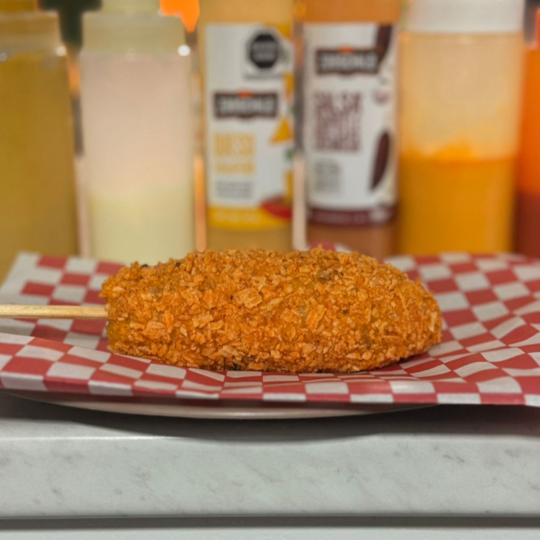 Banderilla con masa coreana rellena de queso y salchicha empanizada con panko, pidela con el empanizado de tu preferencia.