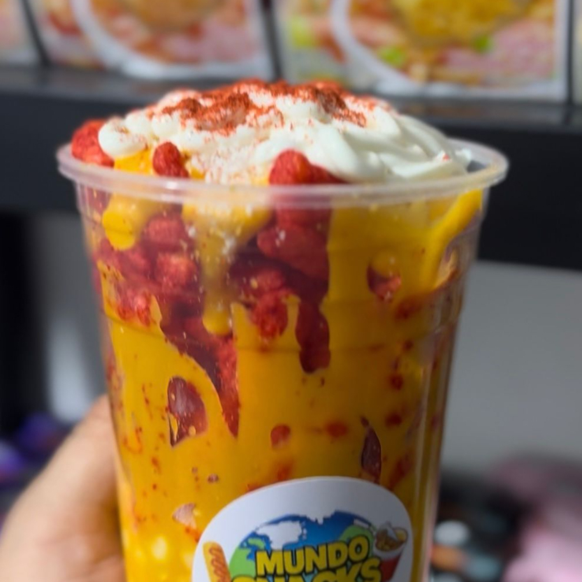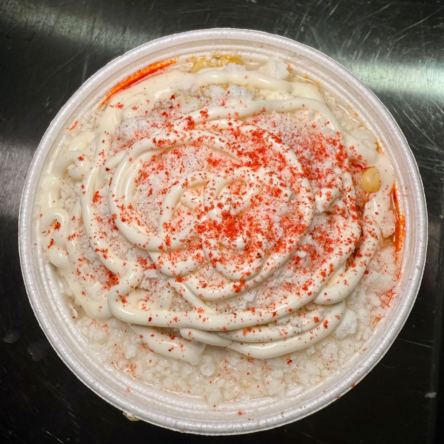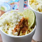 Servido en vaso de 12 onzas, chile en polvo, queso en polvo, crema y limón.
