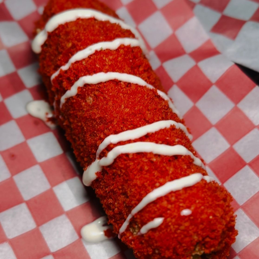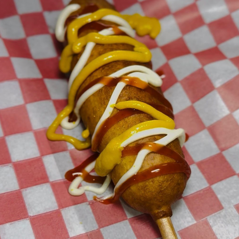 Banderilla con masa coreana rellena de salchicha empanizada con panko, pidela con el empanizado de tu preferencia.