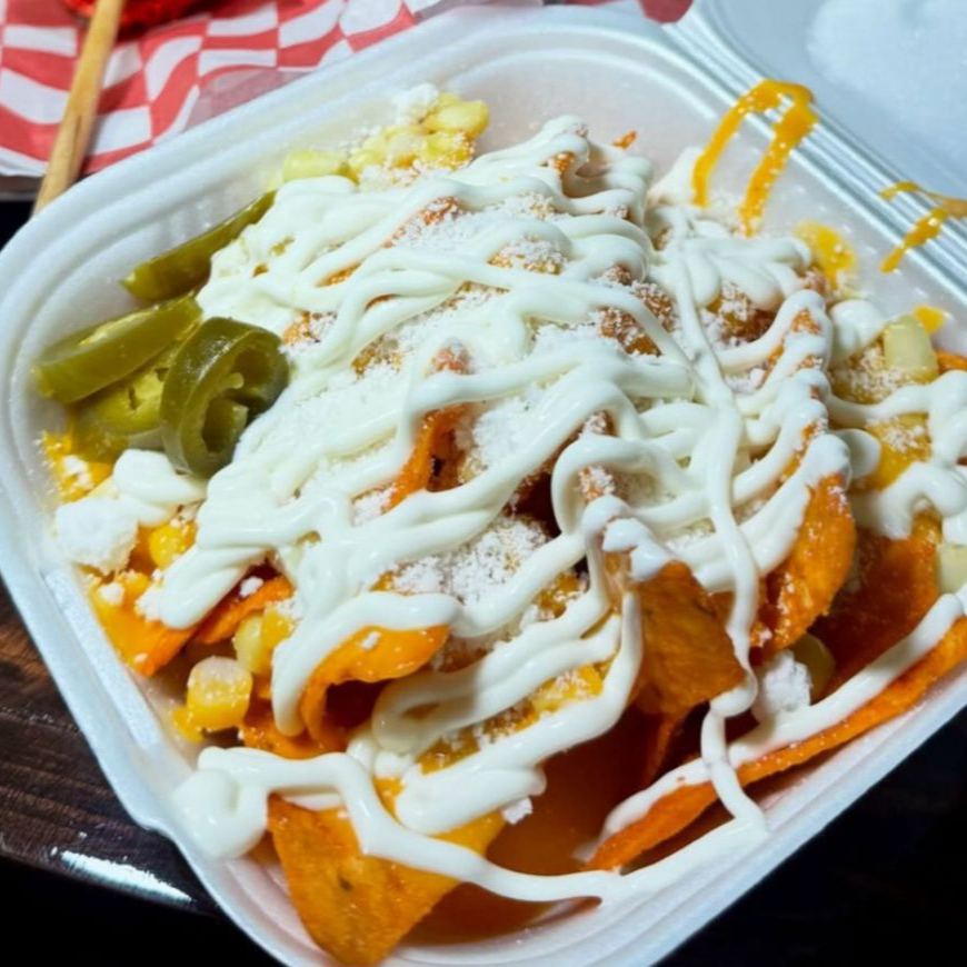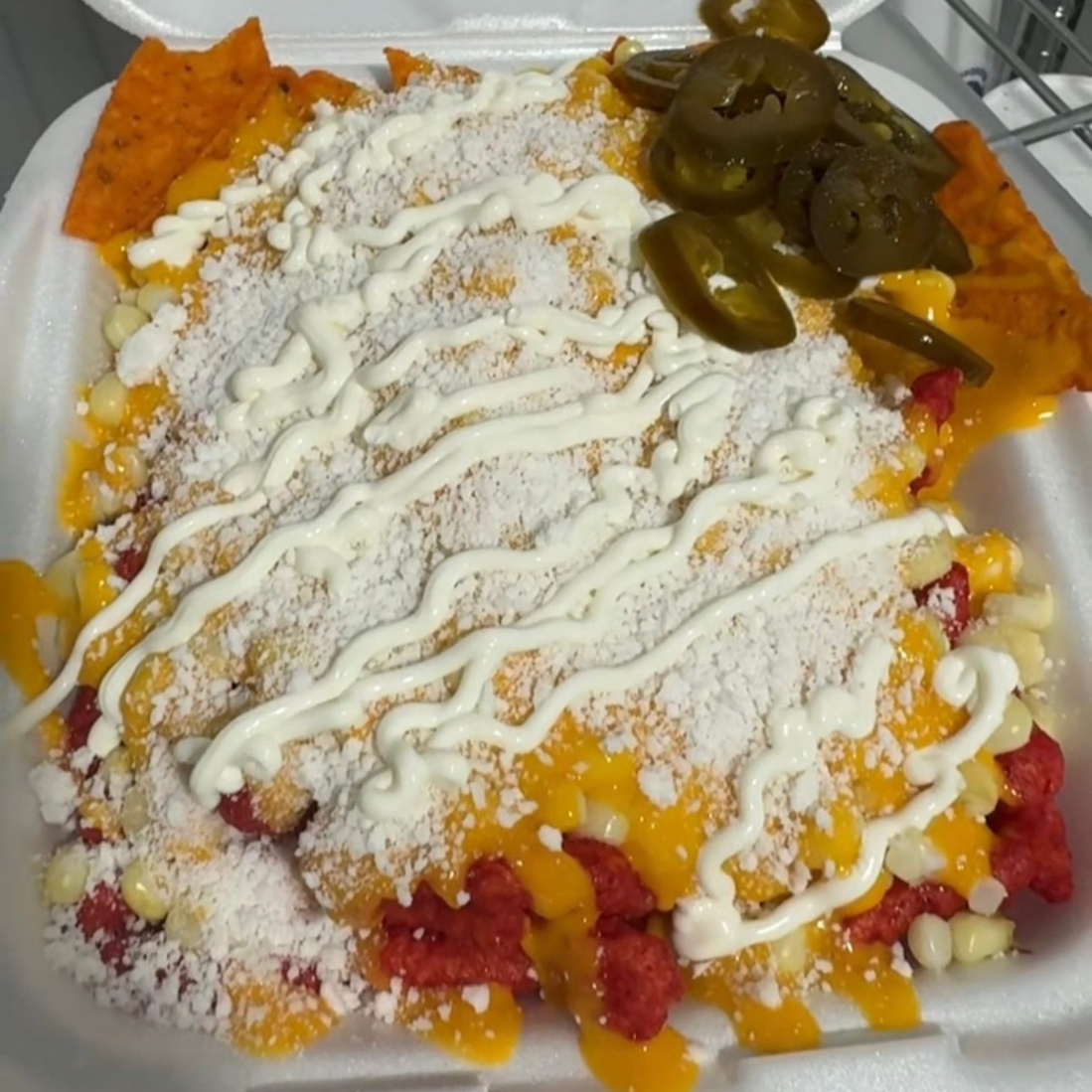 Cheetos flamin hot con elote, queso amarillo, chile en polvo, queso en polvo, crema y limón.