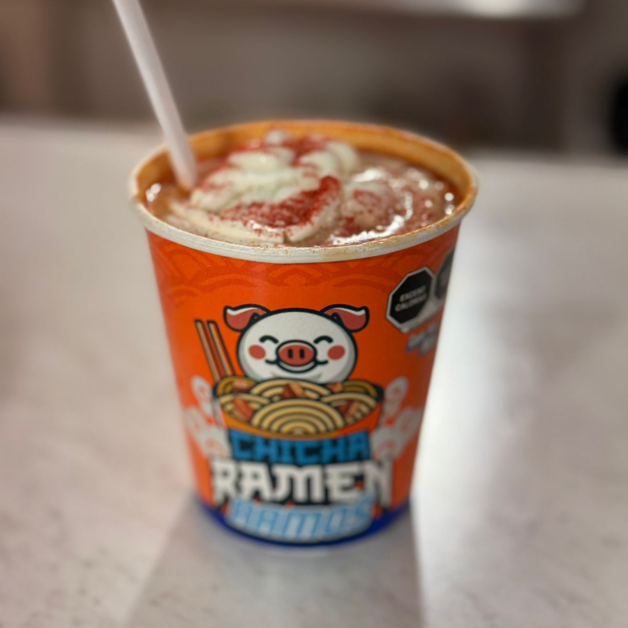 Sopa chicharramen con chicharron de la ramos de tu preferencia servido en un vaso de medio litro lleno de elote con tus salsas favoritas, chile en polvo, queso en polvo, crema y limón.