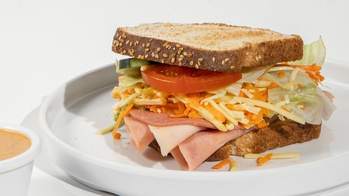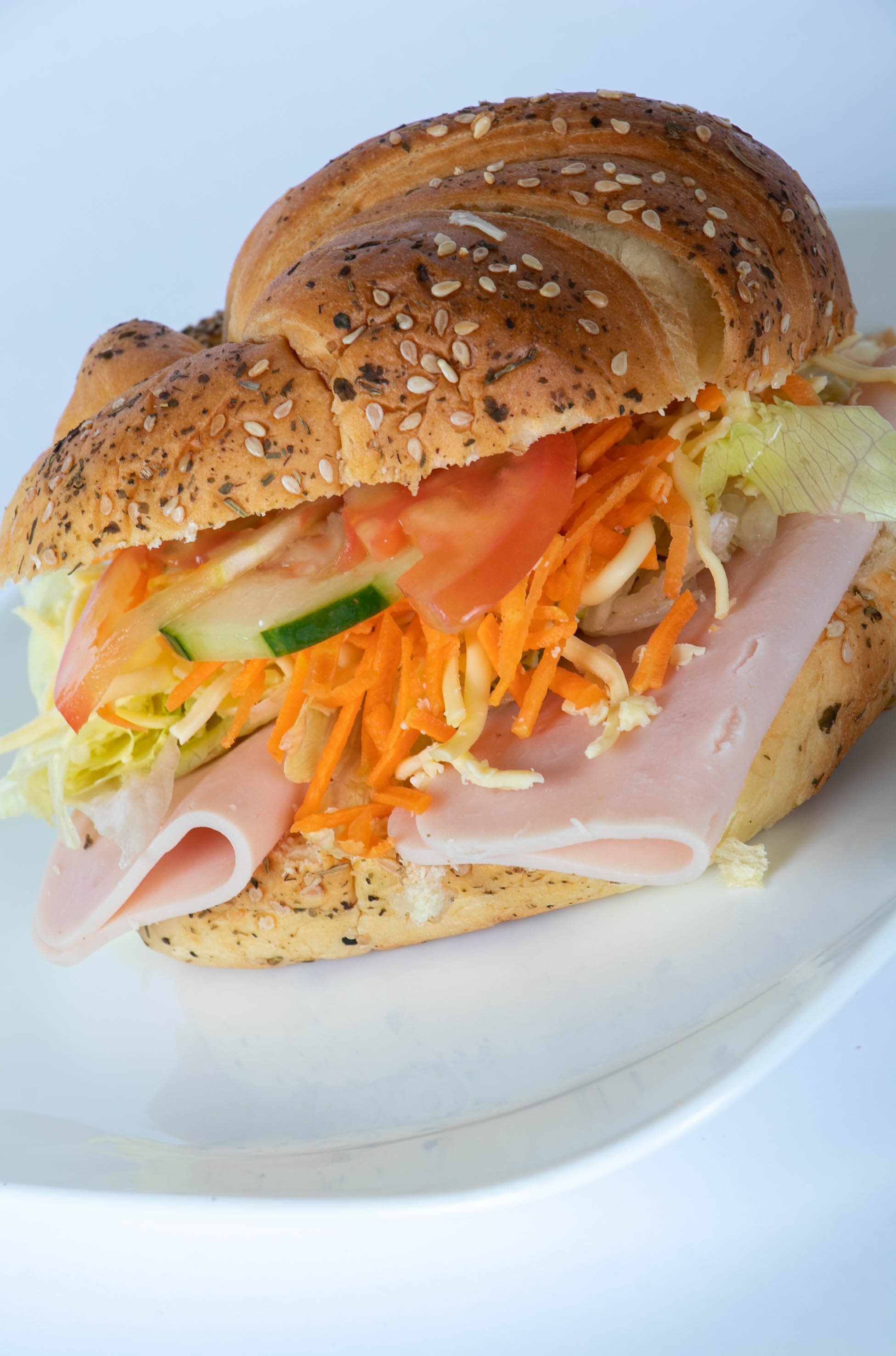 cuernito de mantequilla con jamón de pavo, queso chihuahua, lechuga,tomate, zanahoria, pepino, mayonesa y aderezo ranch