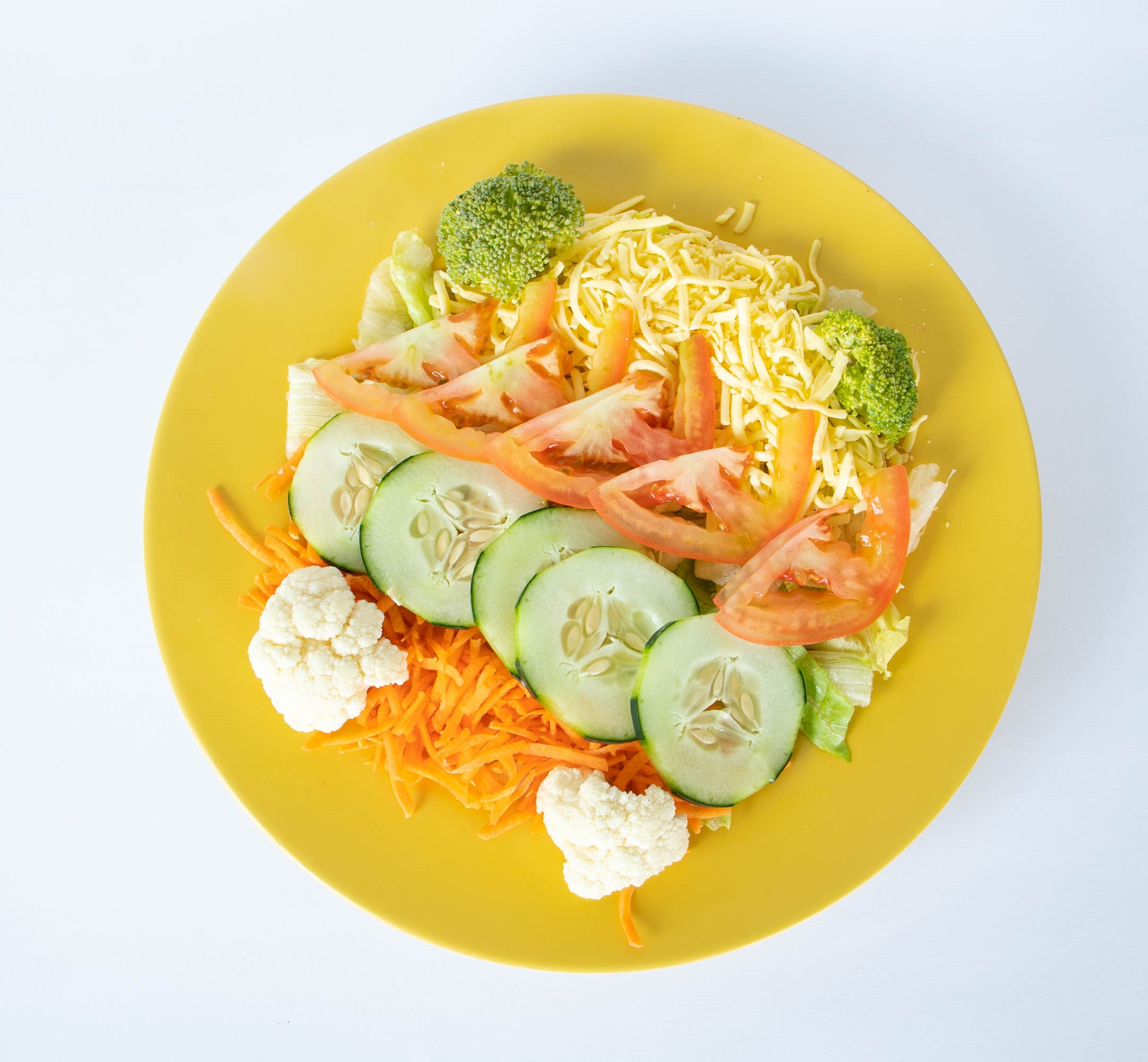 Lechuga romana, zanahoria, tomate, queso chihuahua, pepino, brocoli y coliflor