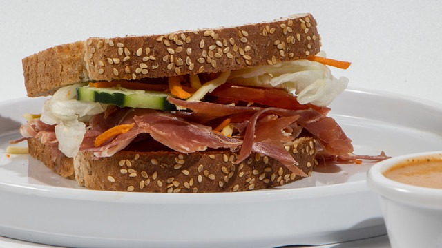 sandwich de jamon serrano con queso chihuahua, lechuga, tomate, zanahoria, pepino, mayonesa y aderezo ranch