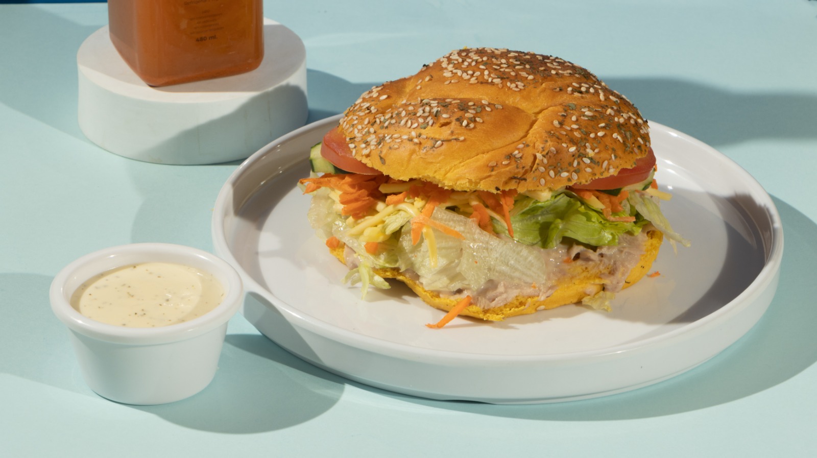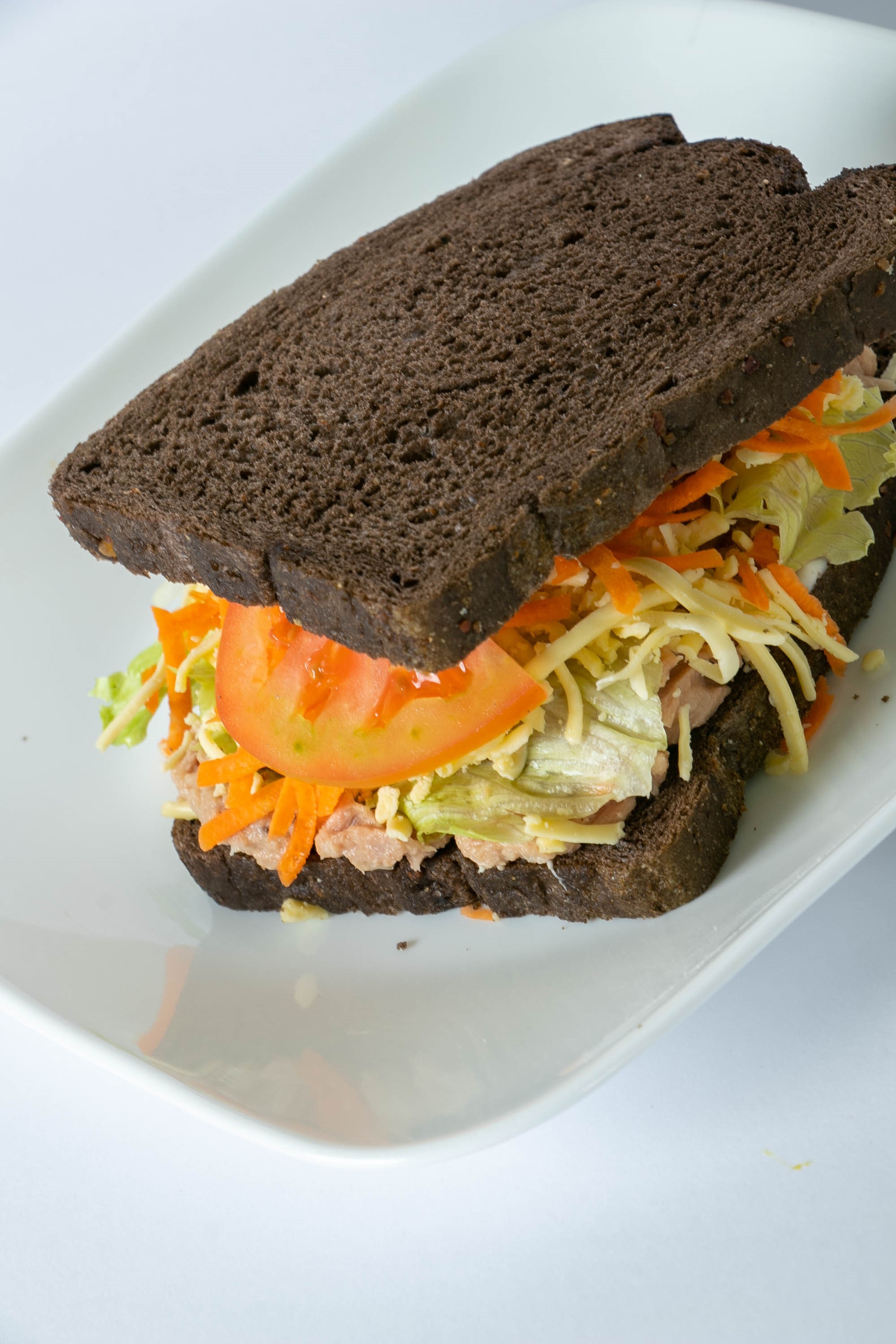 cuernito de mantequilla con atun preparado con mayonesa y limón, queso chihuahua, lechuga, tomate, zanahoria y aderezo ranch