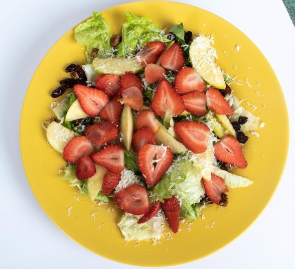 Combinación de lechugas, fresa, arandanos, manzana, nuez garapiñada, quedo de cabra y vinagreta fresa