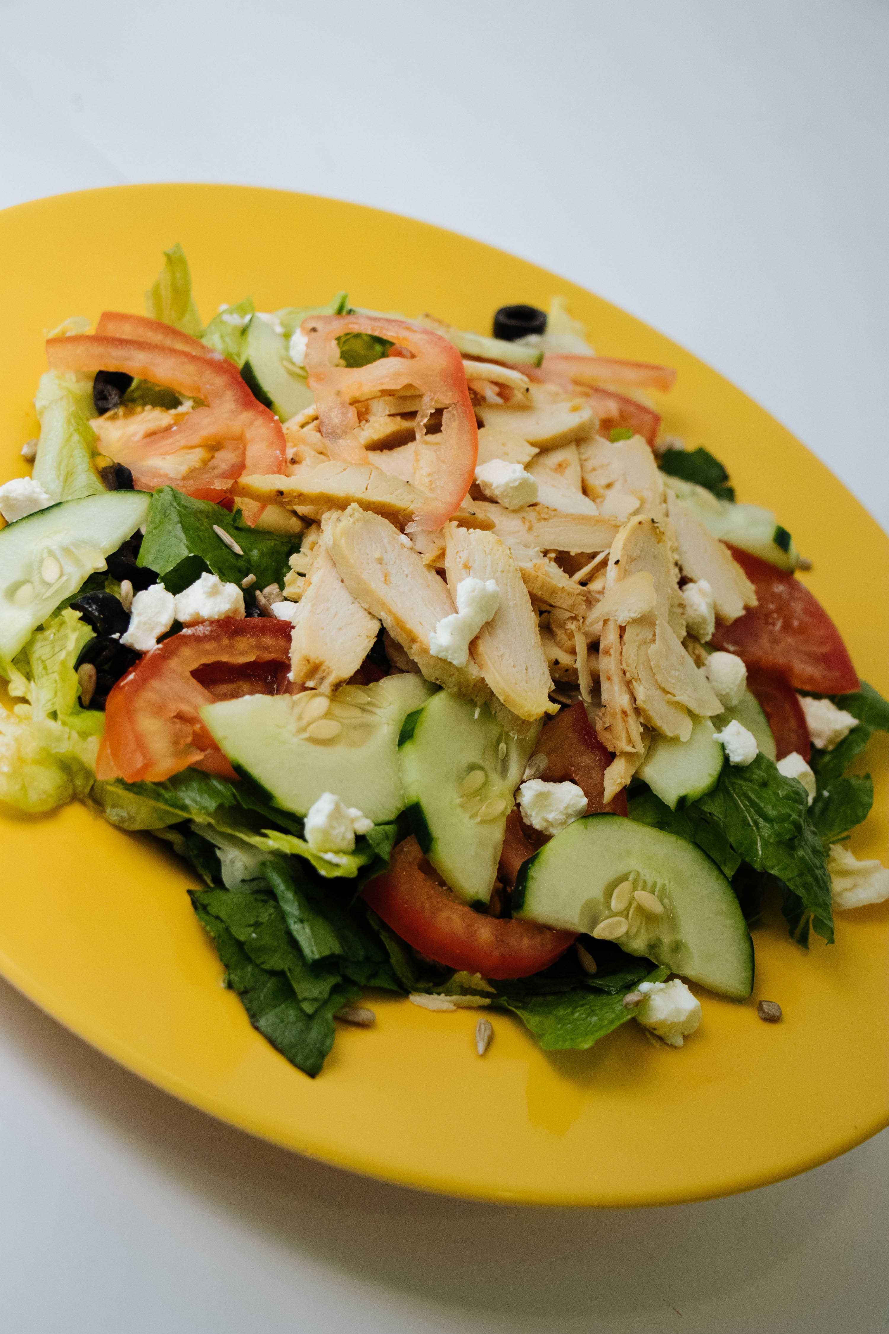 Combinación de lechugas y aceitunas negras, pepino, queso de cabra y semillas