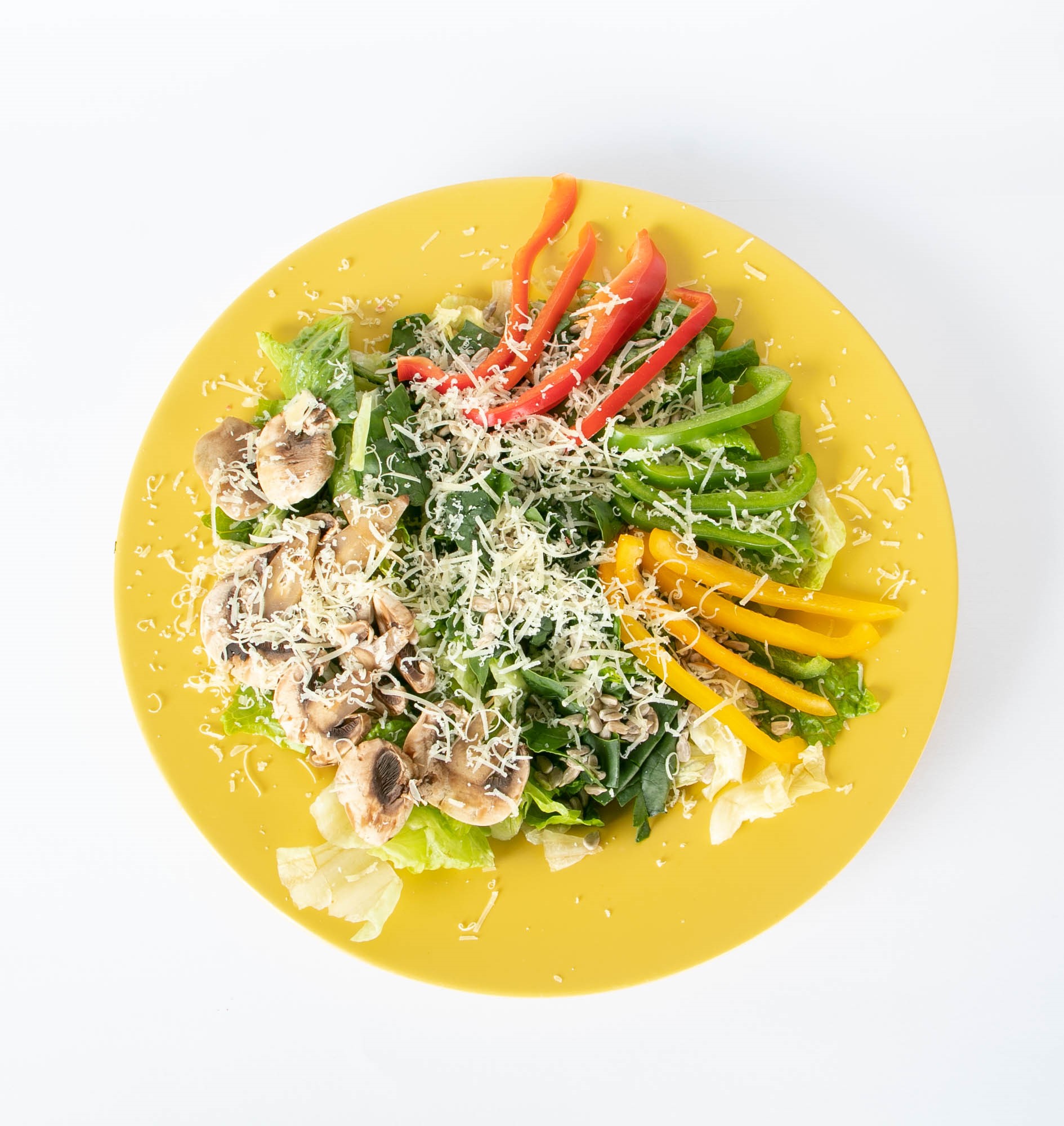 Combinación de lechugas, espinacas, queso parmesano, semillas de girasol, champiñon y pimiento morron