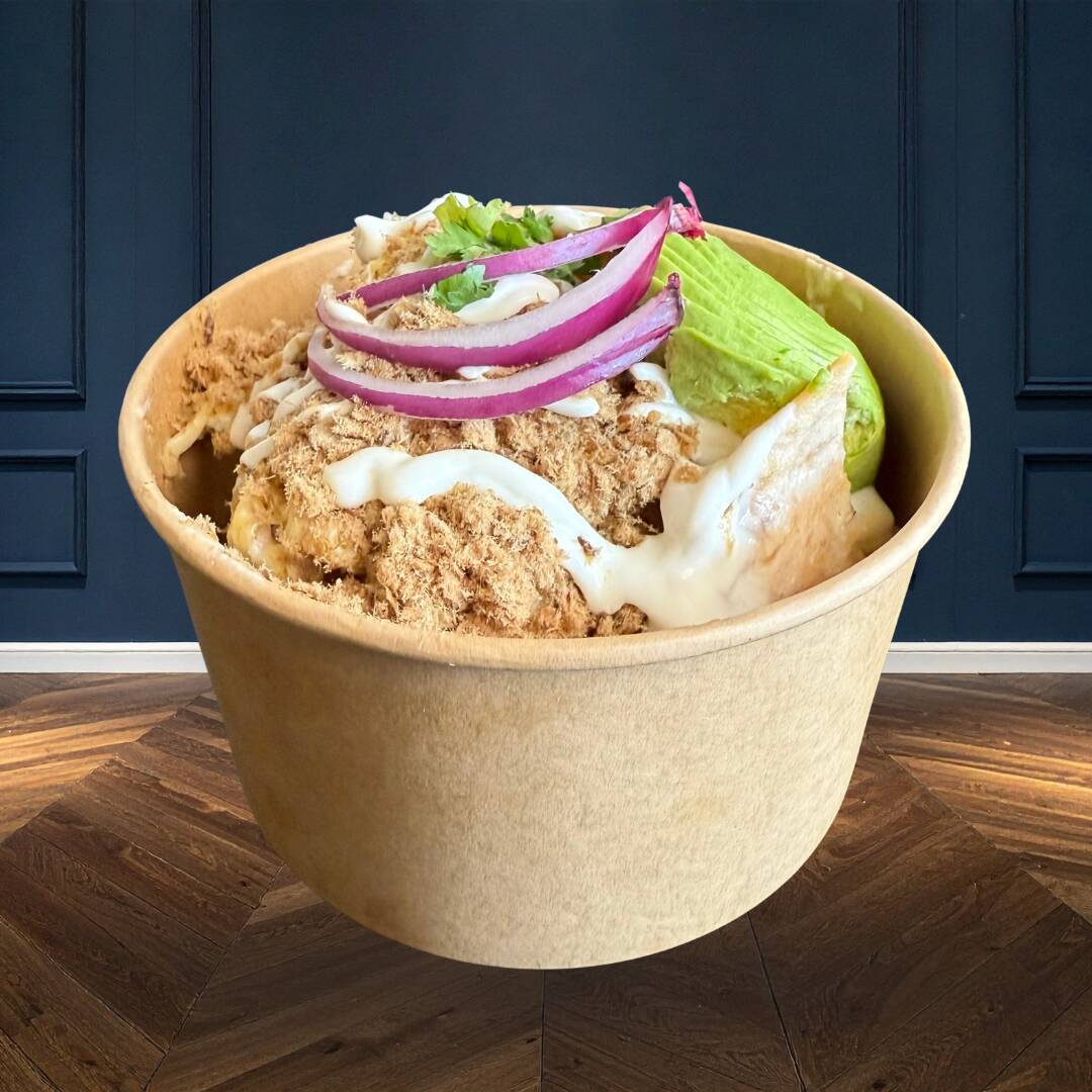 Tortilla frita bañada con salsa blanca de habanero, queso gratinado, cilantro, cebolla morada, aguacate, crema y carne seca machacada.