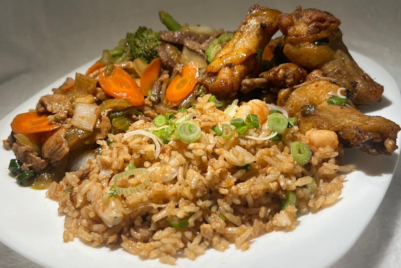 Platillo con arroz (proteína pollo) o espagueti (proteína res) acompañado de una porción de camarón.