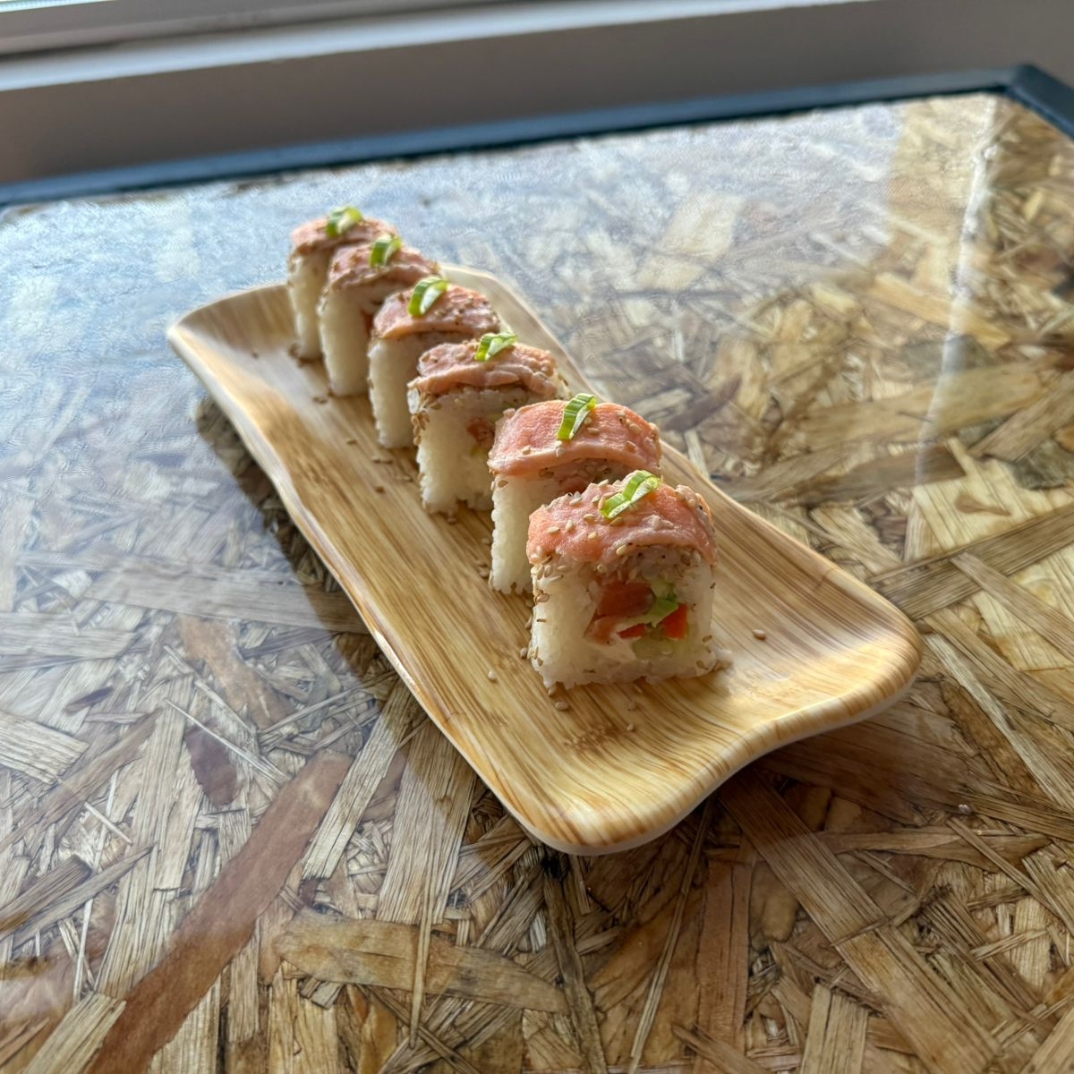 Un delicioso rollo de arroz, relleno de filete de res a la plancha, queso crema y cebolla morada, coronado con chicharrón de pulpo, ajonjolí y cebollín, bañado en una salsa de mango habanero ligeramente picante.