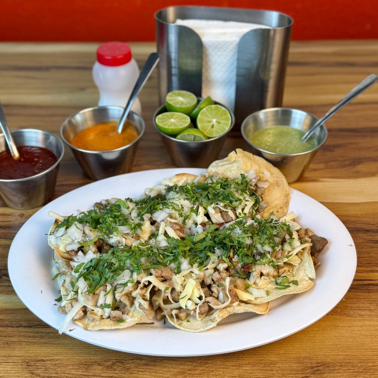 6 tostaditas de chuleta de cerdo con queso gratinado. Incluye cebolla, cilantro, limones y salsa a elegir.