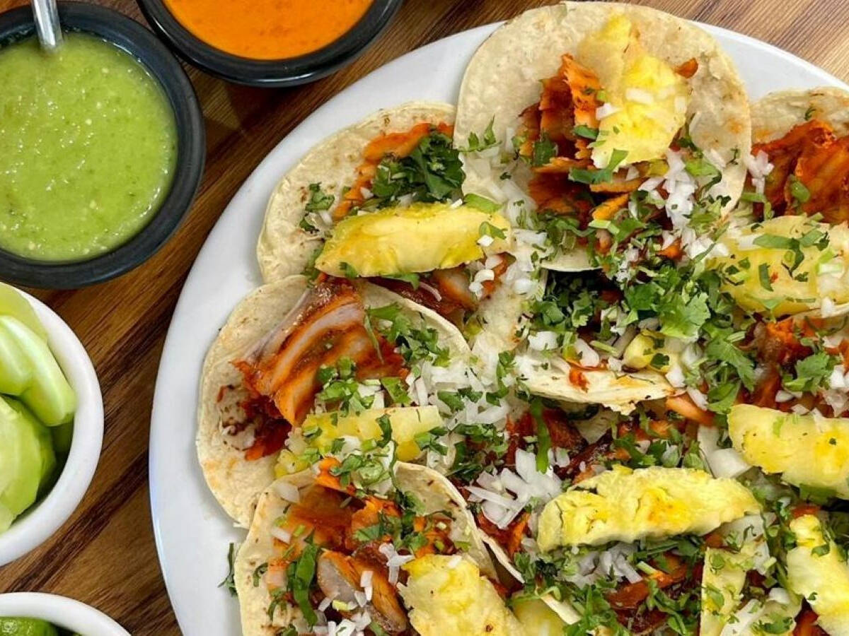 Orden de 5 tacos campechanos. Incluye cebolla, cilantro, piña, limones y salsa a elegir.