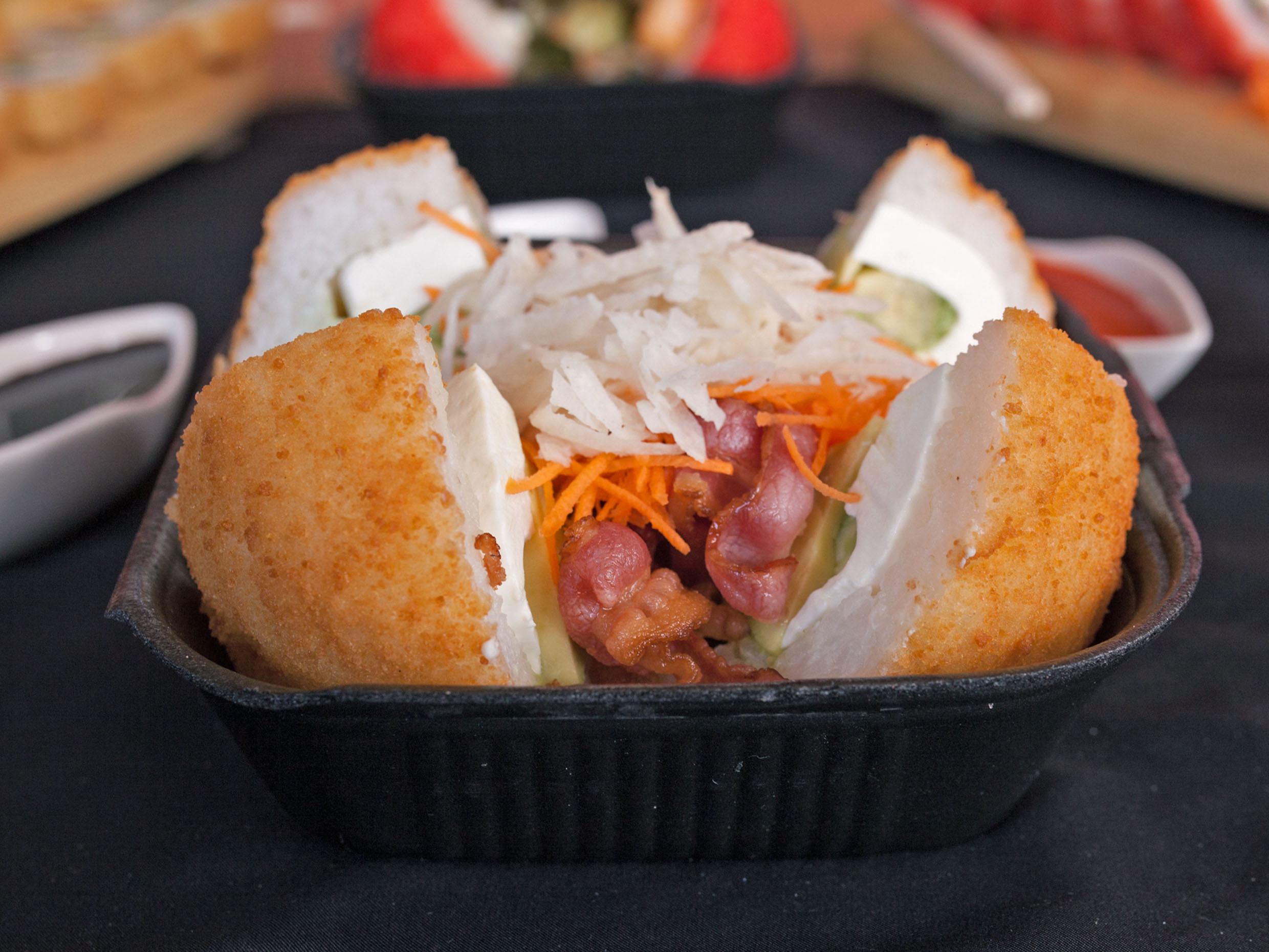 Caja con 5 sushis empanizados, armada y seleccionada por la tienda, Cangrejo, Camaron, Tocino, Res y pollo, incluye zanahoria y pepino, 4 chipotles, 2 soyas y 2 anguilas.