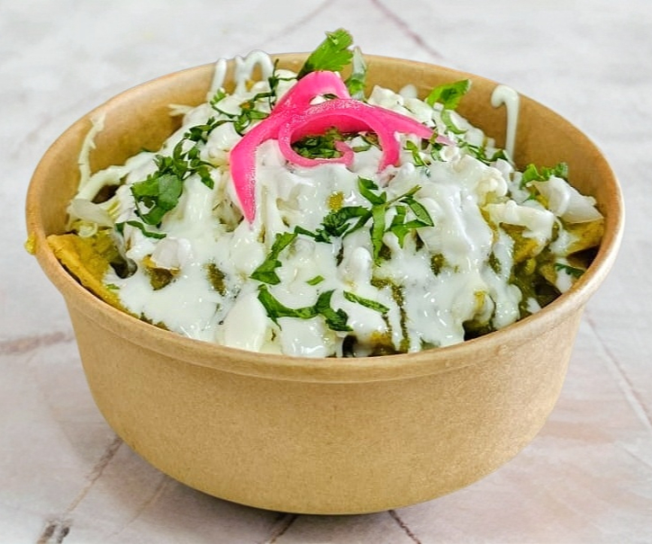 Chilaquiles en tu salsa Favorita + Pollo + Queso + Crema + Cebolla + Cilantro