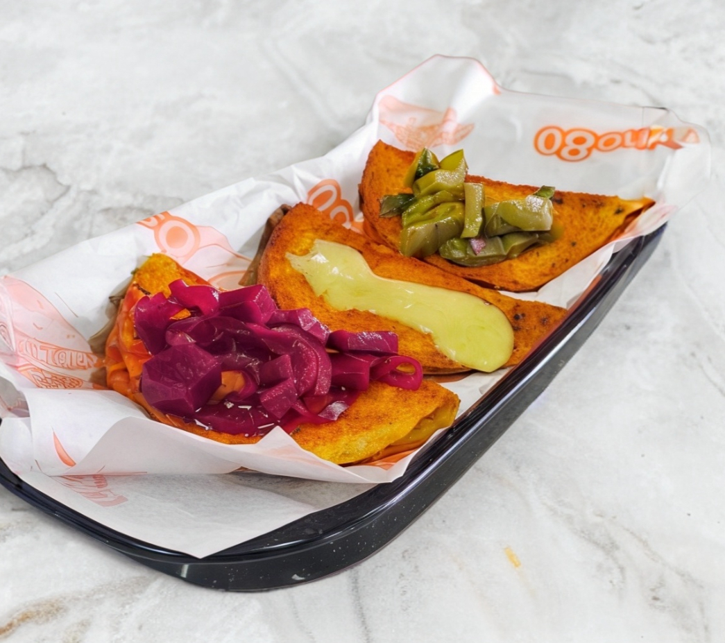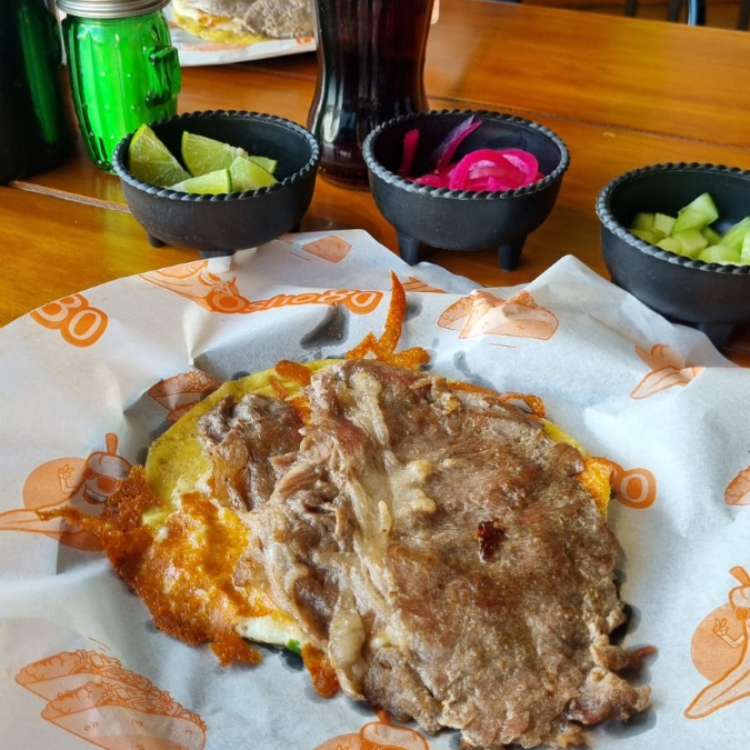 Taco de 2 tortillas de maiz montadas sobre una cama de costra de queso y servido con una sabana de Bistec