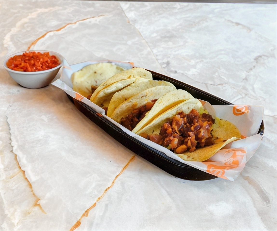 4 tacos de frijoles sudados en canasta, acompañados de cebollitas moradas curtidas, nopalitos y salsas