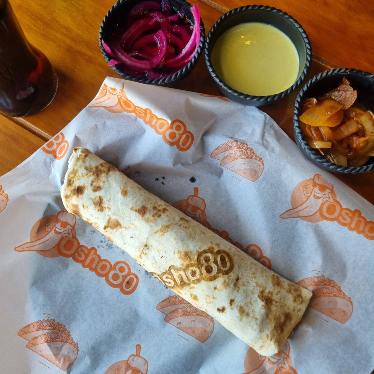 4 tacos de papas con chorizo sudados en canasta, acompañados de cebollitas moradas curtidas, nopalitos y salsas