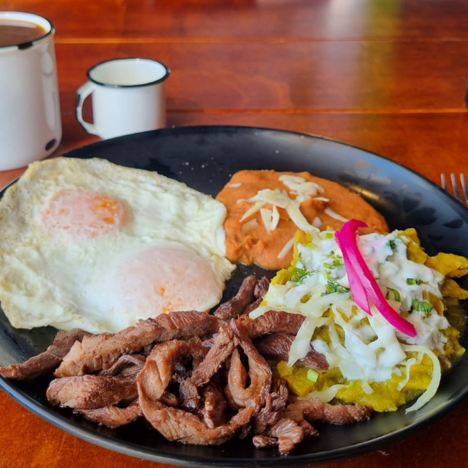 Huevos Estrellados + Chilaquiles en tu salsa Favorita + Frijoles + Arrachera