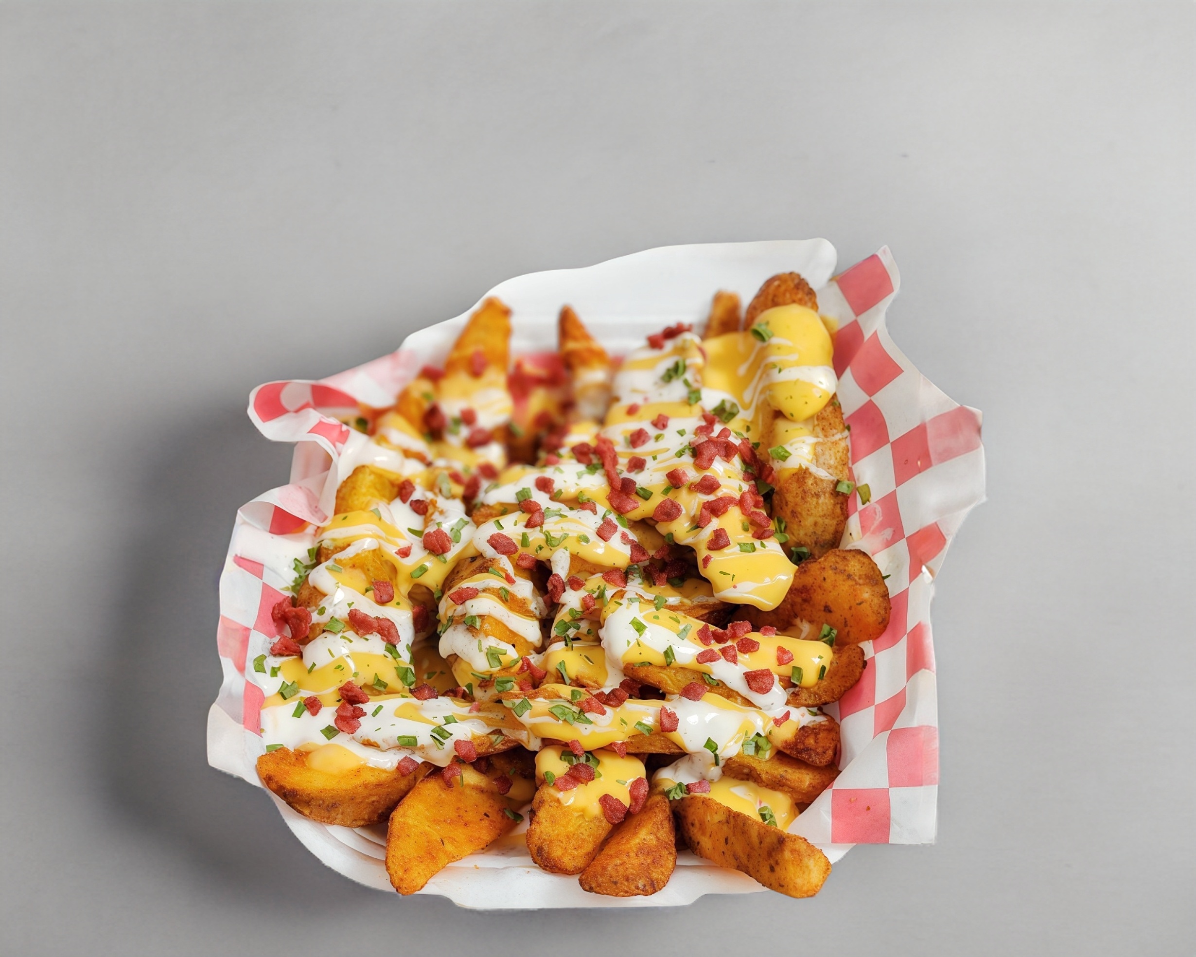 Papas gajos o francesas bañadas con queso amarillo, aderezo de la casa mas 6 piezas de boneless, tocino en trocitos y cebollin.
