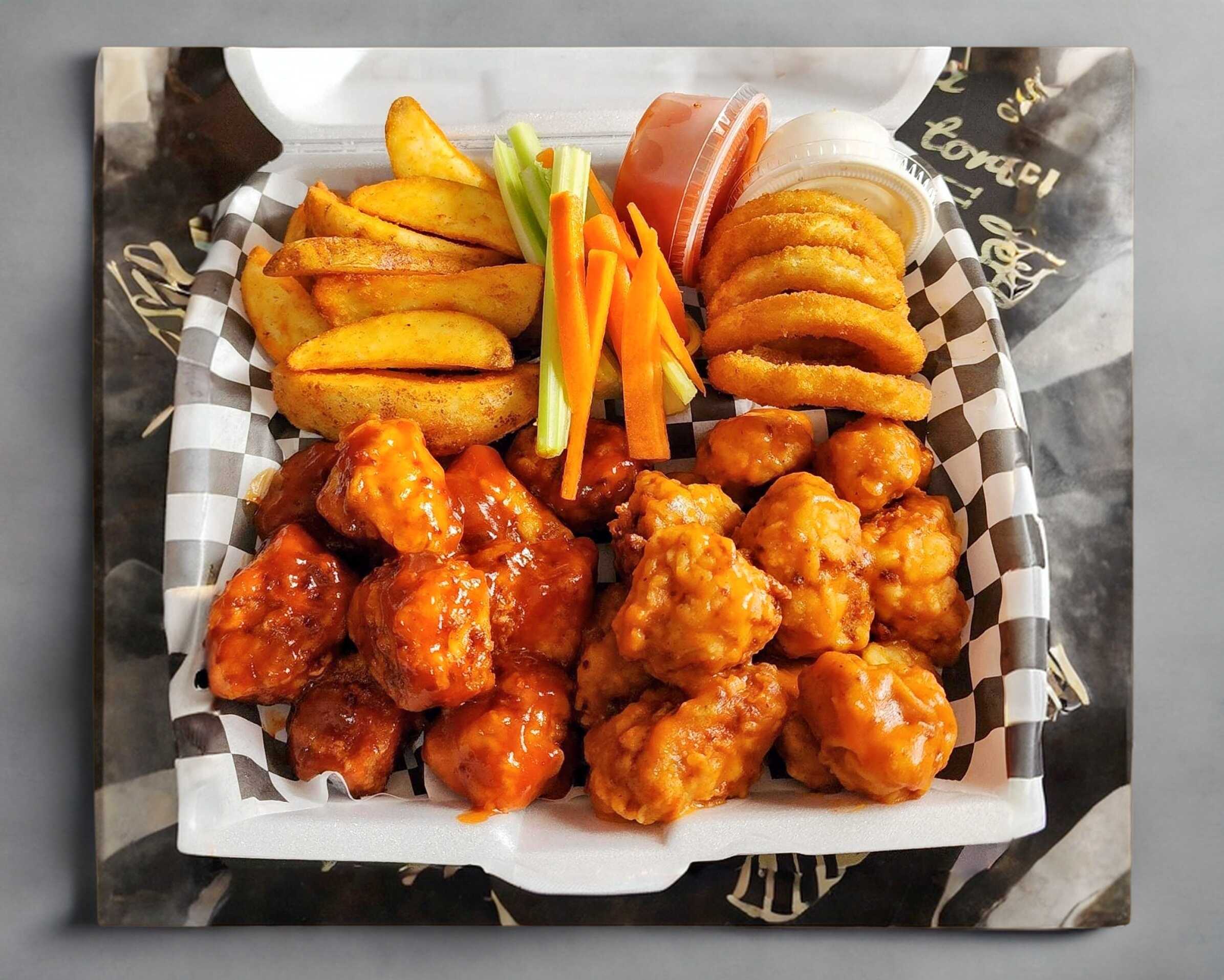 1/2 kg de boneless, 5 aros de cebolla, porción mediana de papas gajos o francesas, catsup, ranch y verduras.