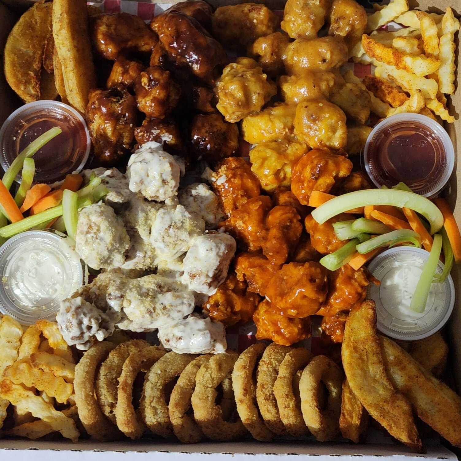1 Kg de boneless, porcion grande de papas francesas y gajos, 10 aros de cebolla, catsup, ranch y verduras