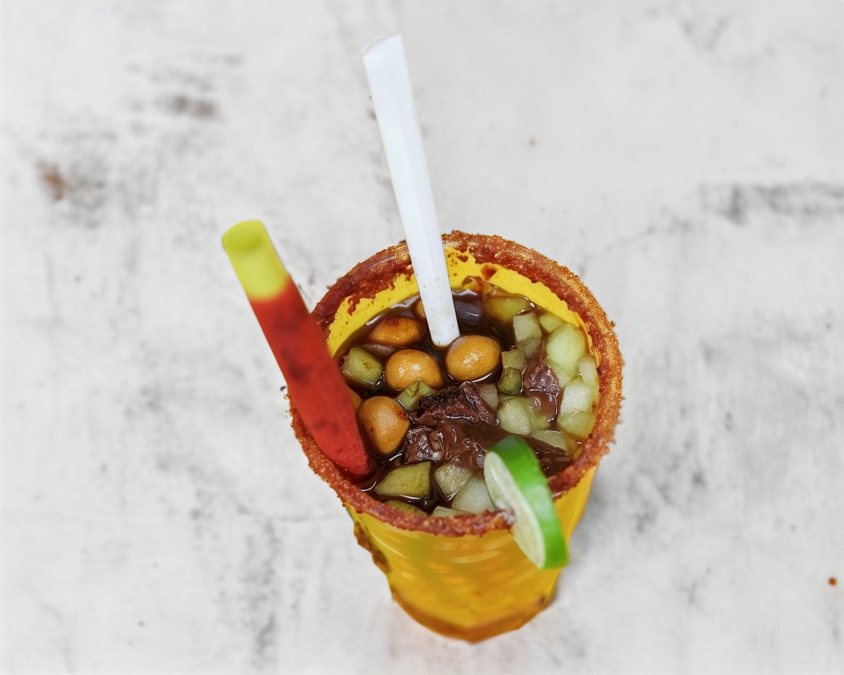 Carne seca, Camarones, Pepino, Cacahuate, Rielitos, Pico de Gallo, salsas y limon