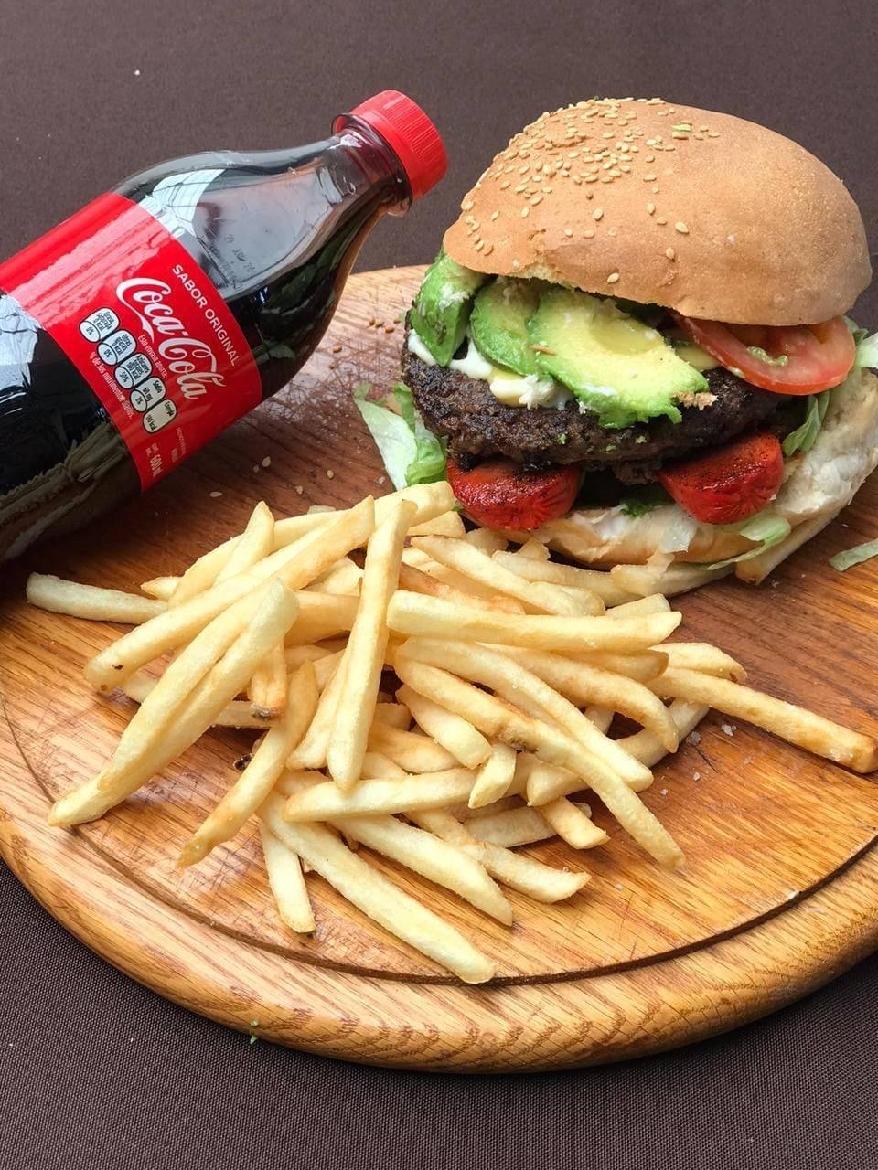 105 gr de carne, 20 gr de queso blanco, Una salchicha para asar, medio aguacate, lechuga , tomate, aderezo y pan