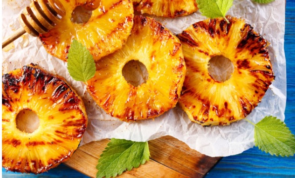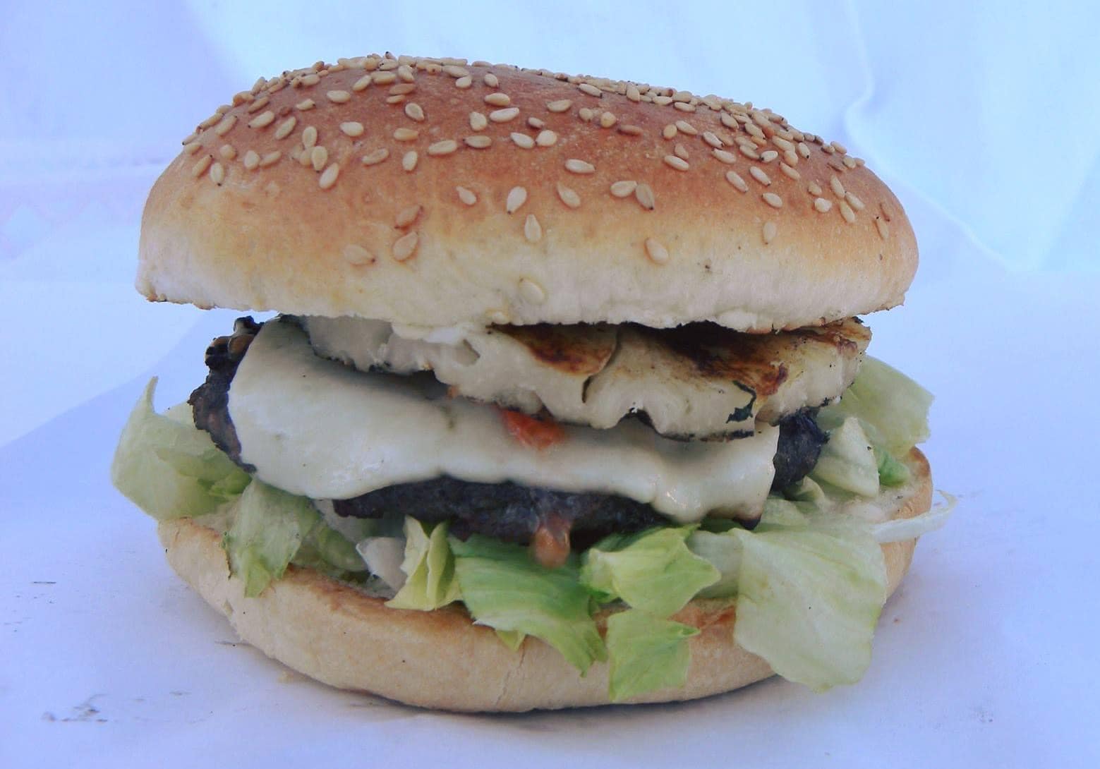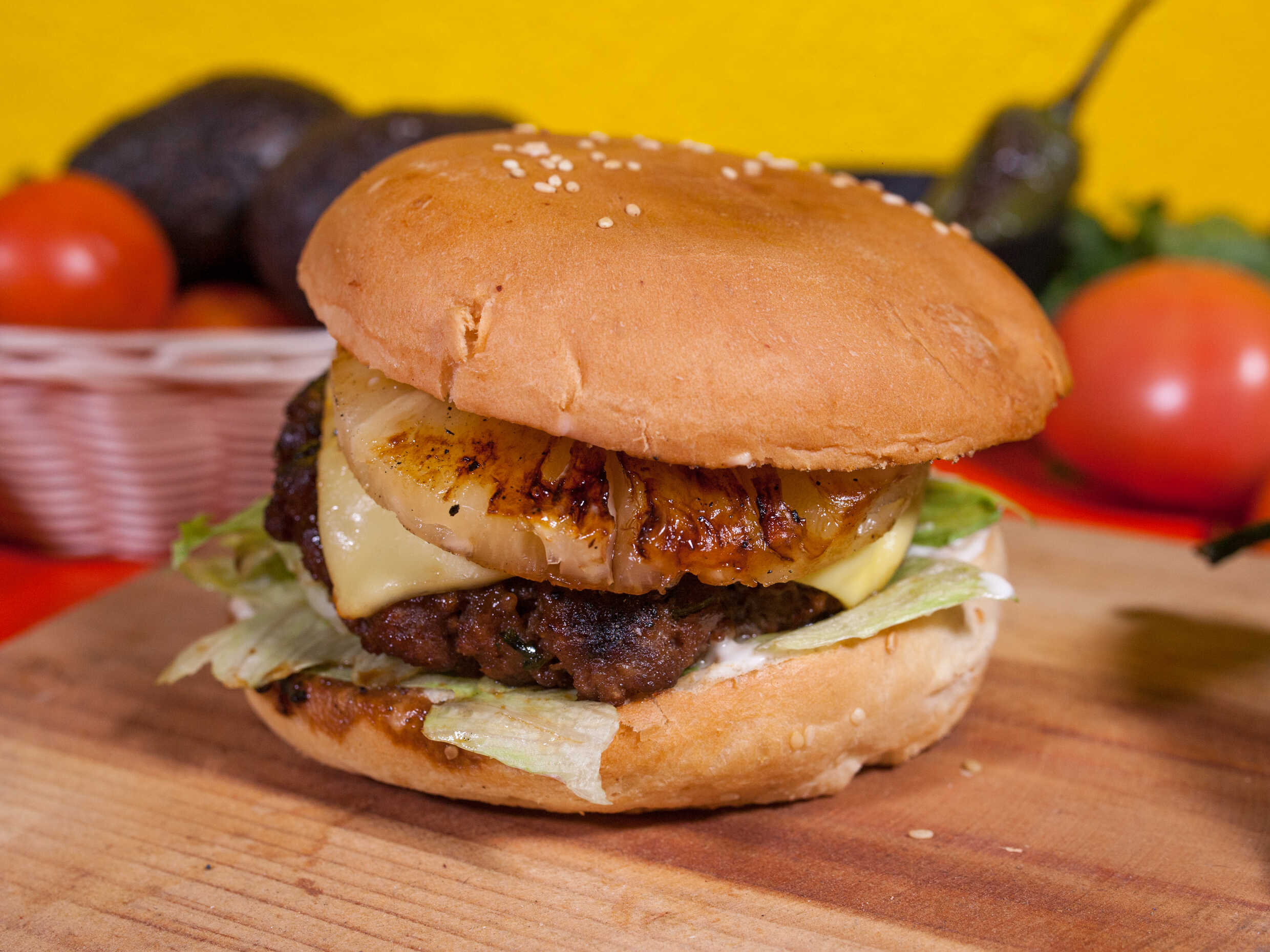 105 gr de carne, 20 gr de queso blanco,rebanada de piña gratinada, lechuga , tomate, aderezo y pan