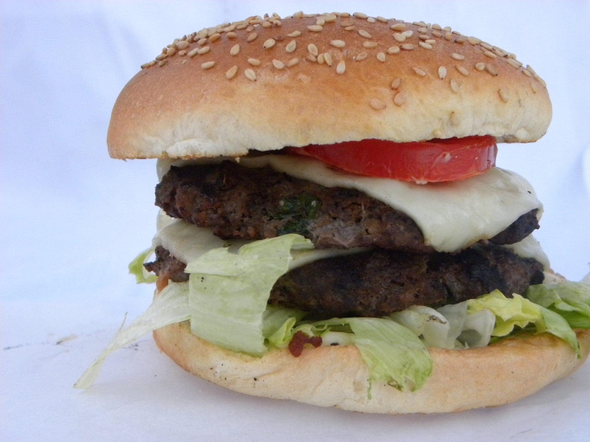 210 gr de carne, 40 gr de queso blanco, lechuga , tomate, aderezo y pan