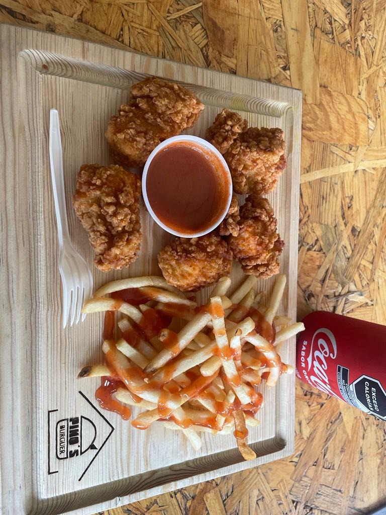 220 gr. De papas frencesas , 2 0z. Queso amarillo, 105 gr. De carne, 20, gr de queso blanco