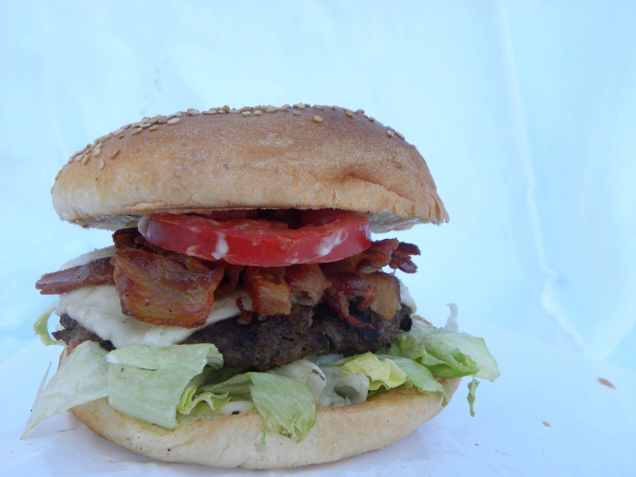 105 gr de carne, 20 gr de queso blanco, 80 gr de tocino, lechuga , tomate, aderezo y pan
