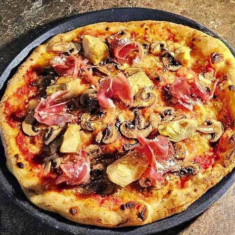 Salsa pomodoro, queso mozzarella, queso parmesano, champiñones bbybella, prochutto y corazones de alcachofas marinadas.