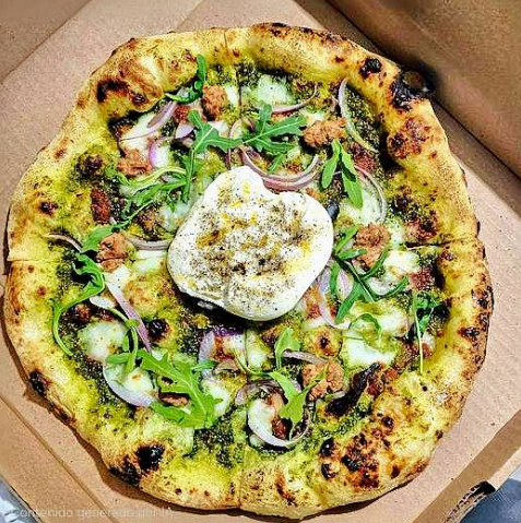No sabes si pedirla, nada mas ve la imagen, base de pesto verde y pesto rosso, acompañada de queso mozzarella, salchicha italiana, cebolla morada, arúgula y por último uno de los quesos más famosos de Italia, el queso burrata, tamaño de las pizzas de 28 a 30 cm aproximadamente.